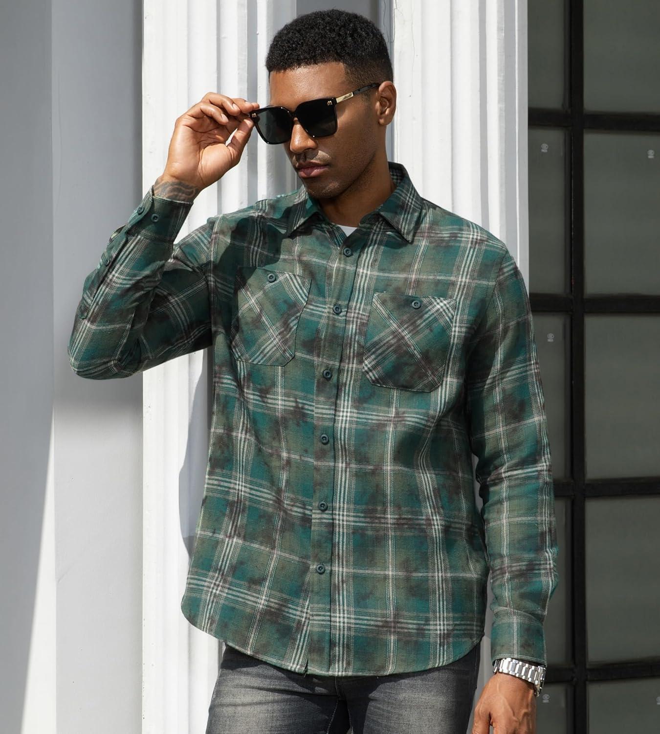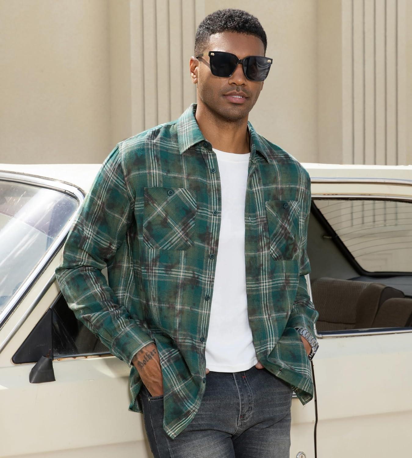 Alex Vando Mens Button Down Shirts Flannel Shirt Long Sleeve(Snow Green)