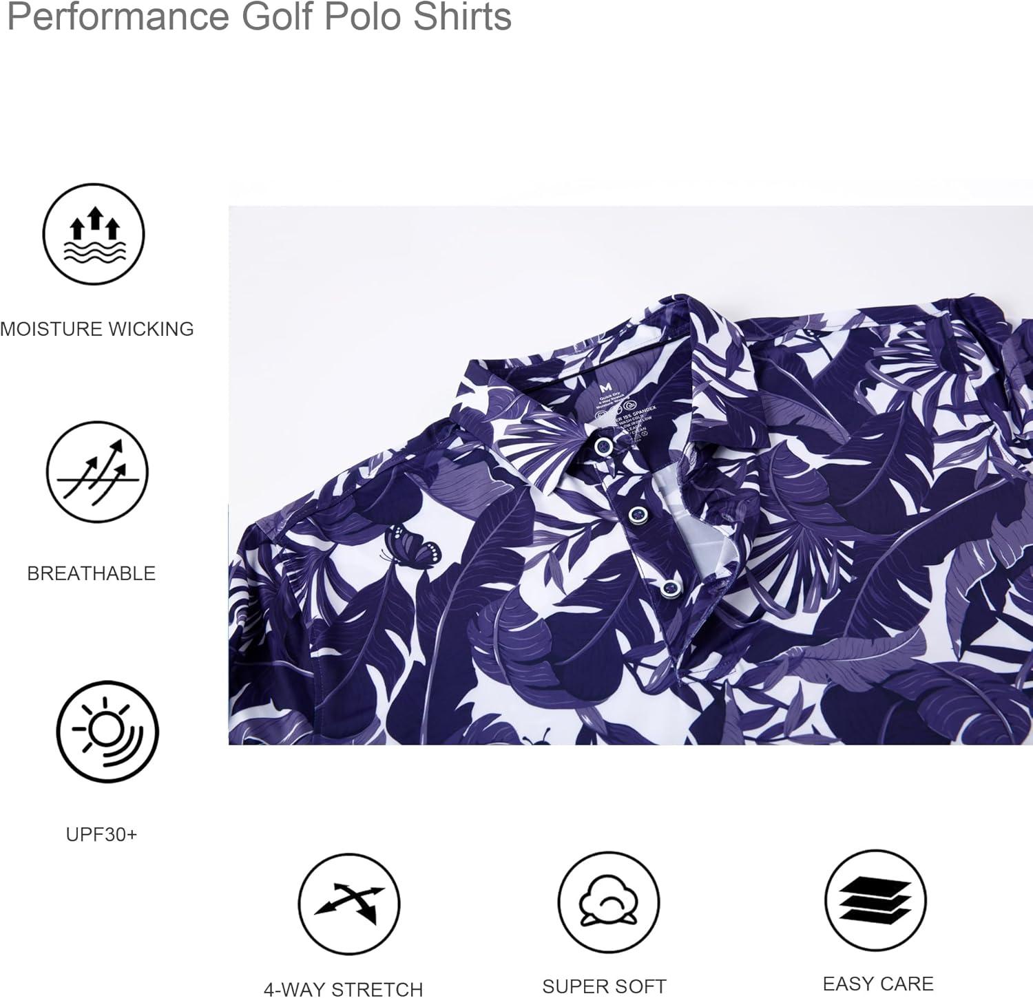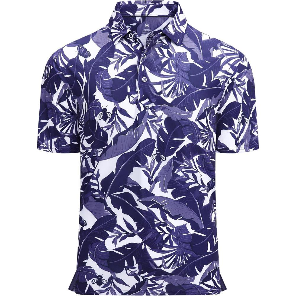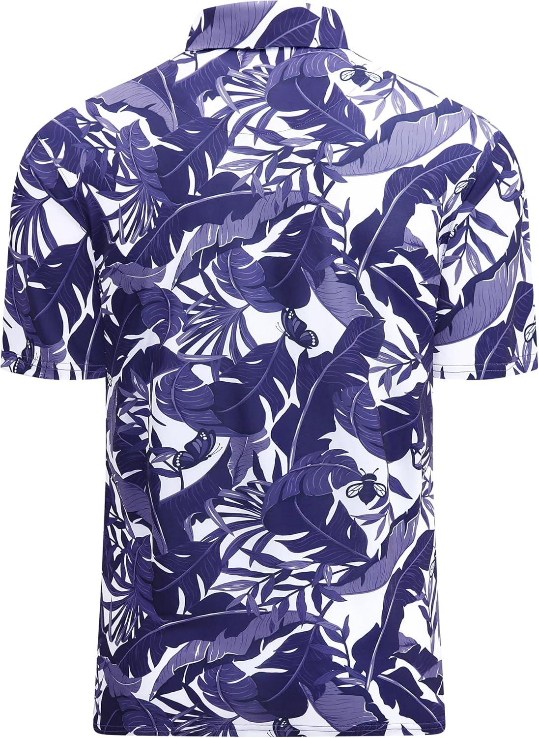 Alex Vando Mens Hawaiian Golf Shirt Moisture Wicking Digital Print Golf Shirts for Men(White With Navy Leaf)