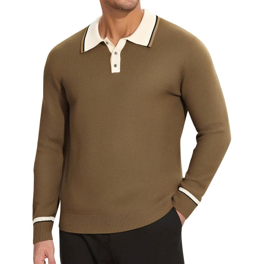 Alex Vando Mens Knit Polo Shirts Long Sleeve Sweater Casual Fashion Classic Button Down Polo Shirts(Brown/White)