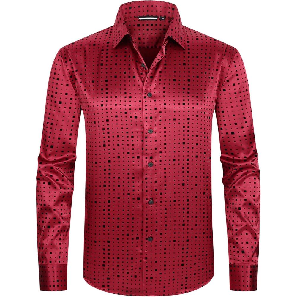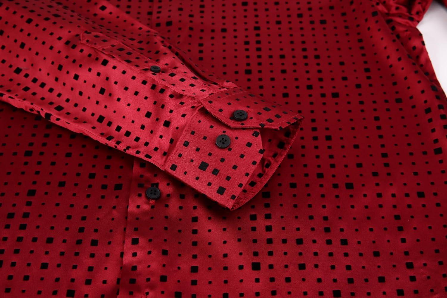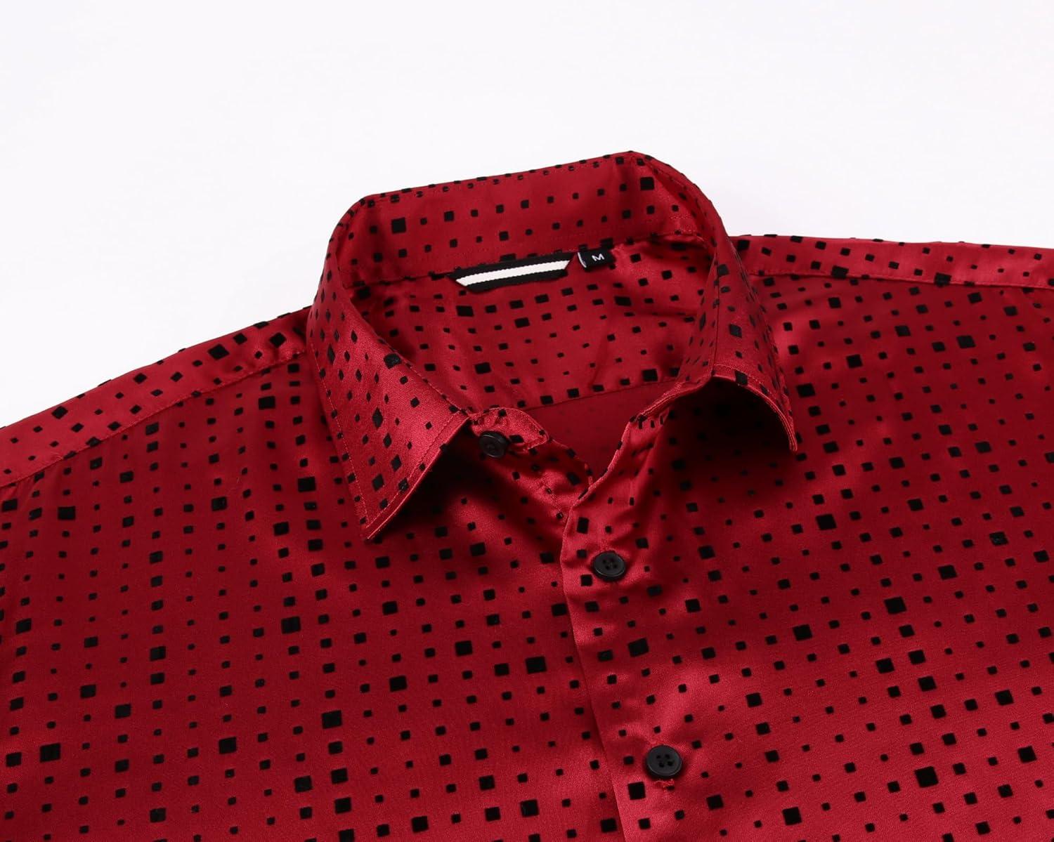 Alex Vando Men’s Luxury Flocked Satin Shirt Long Sleeve Stylish Button Down for Nightlife, Events, and Bold Fashion(Square Burgundy)