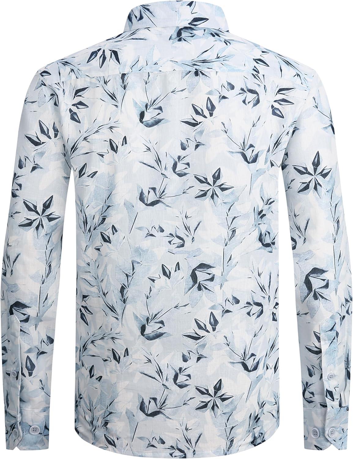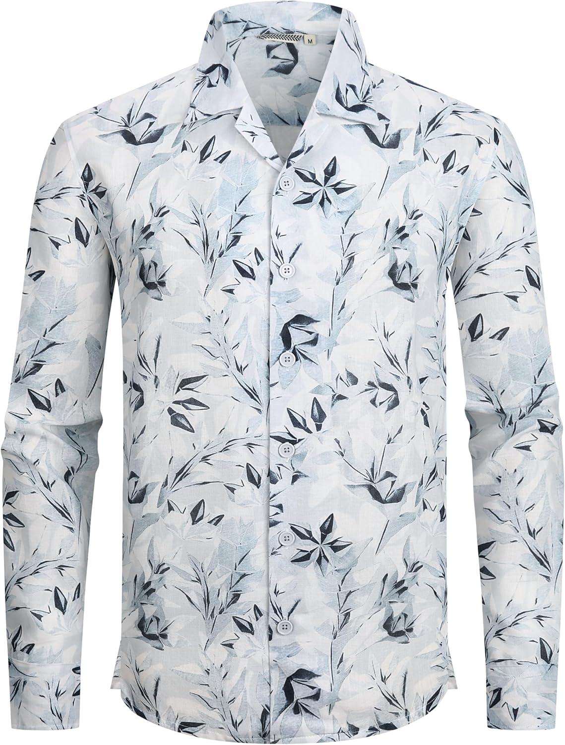 Alex Vando Mens Print Button Down Shirts Linen Cotton Camp Collar Long Sleeve Casual Shirts(White Leaf)