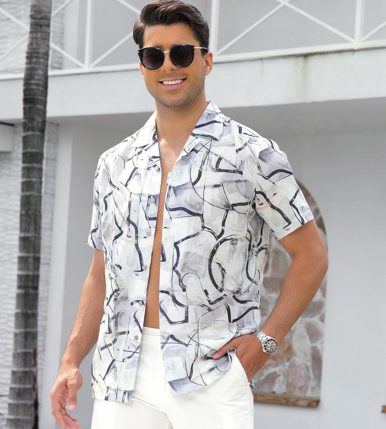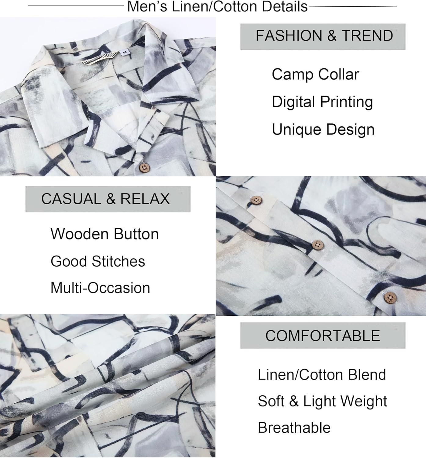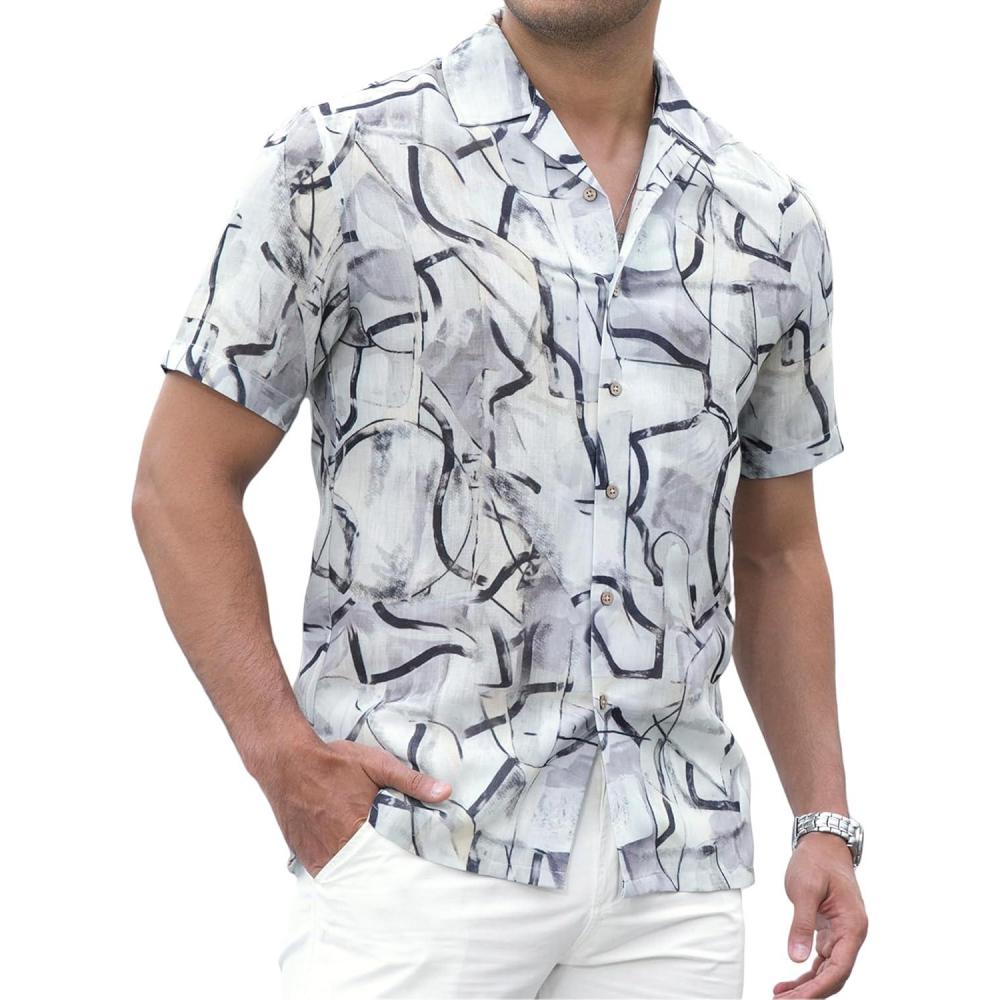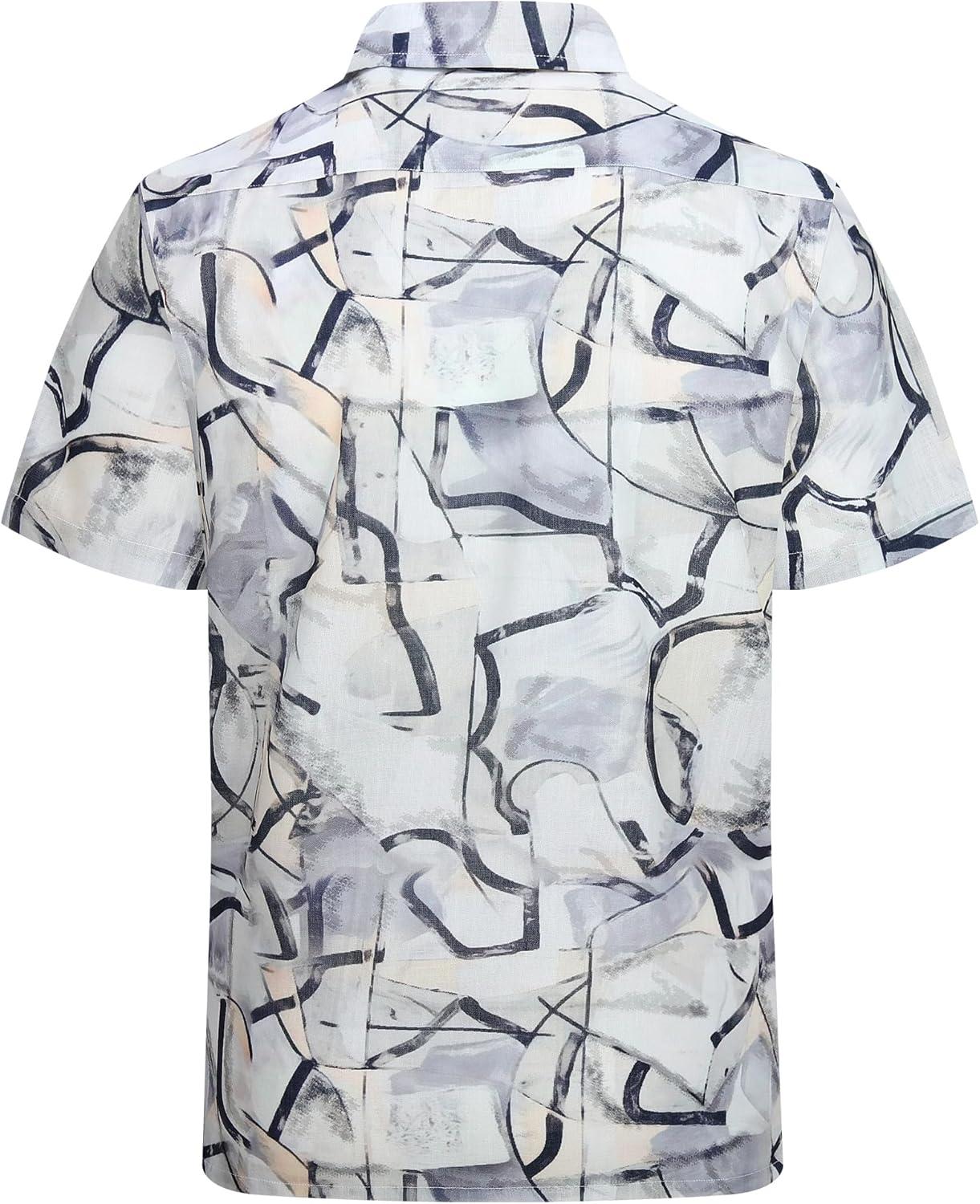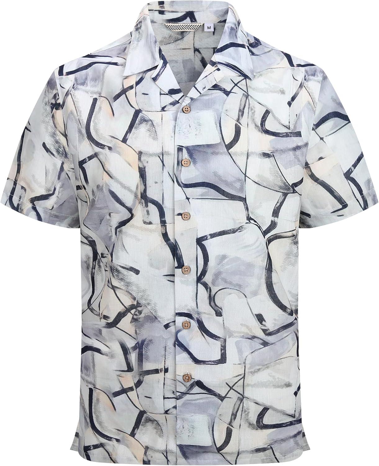 Alex Vando Mens Print Linen Cotton Shirts Short Sleeve Casual Summer Hawaiian Beach Shirt for Men(Black Line)