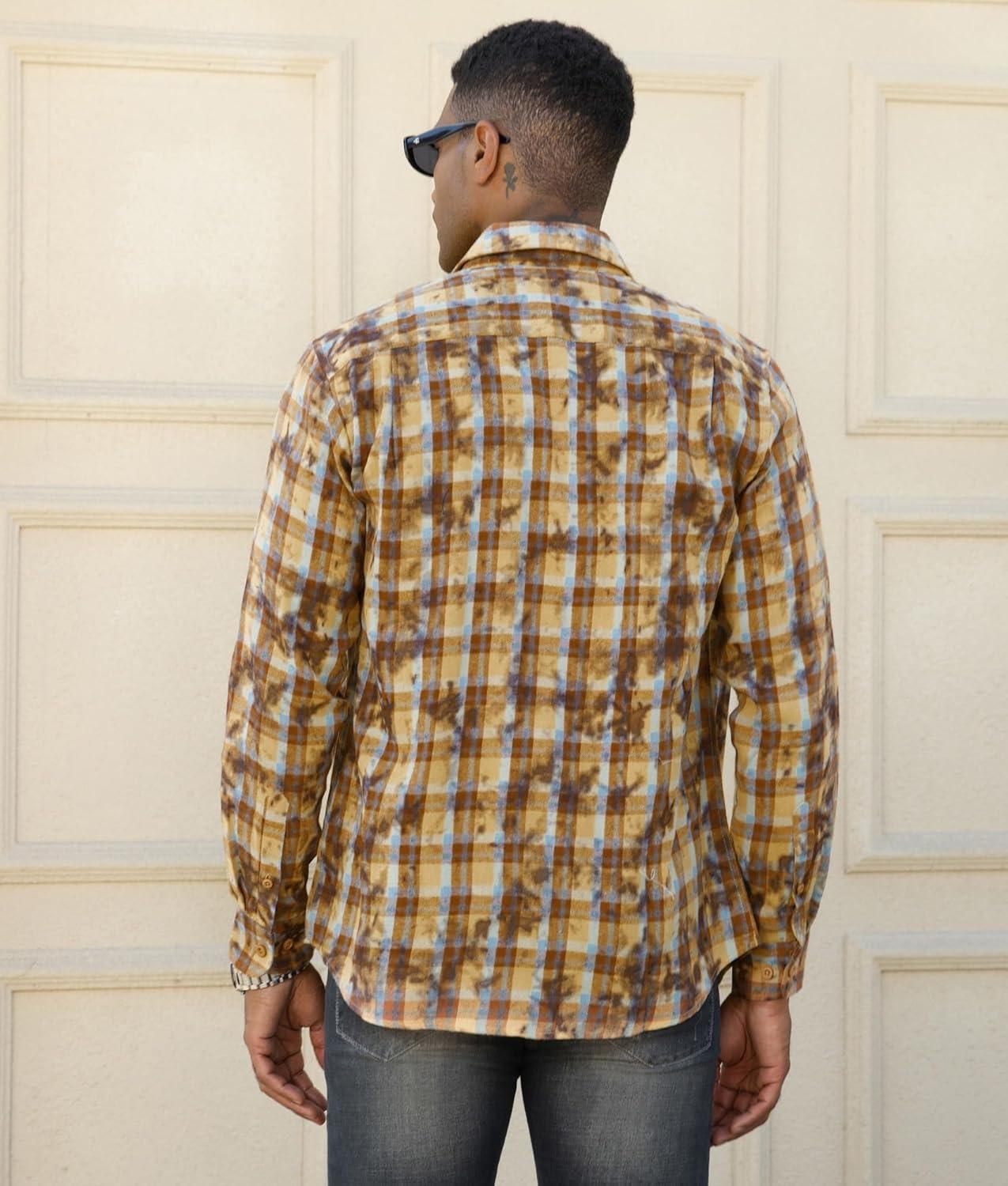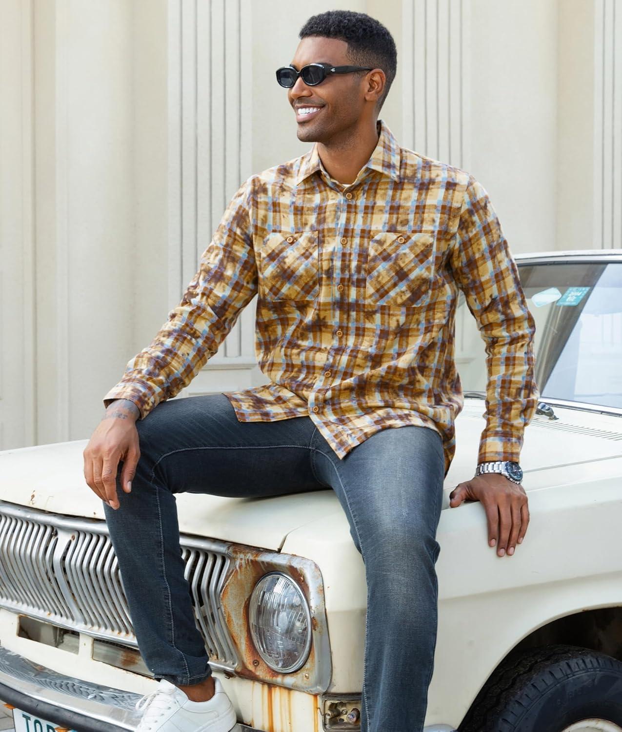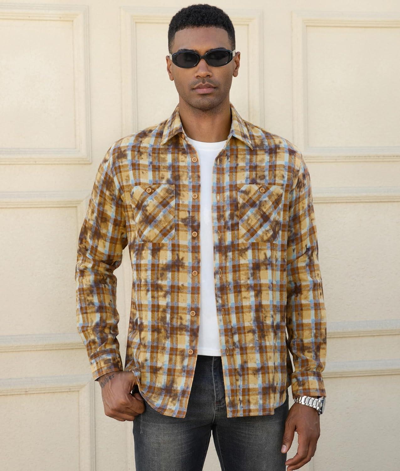Alex Vando Mens Snow Washed Flannel Shirts Regular Fit Long Sleeve Casual Plaid Button Down Shirt(Snow Yellow)