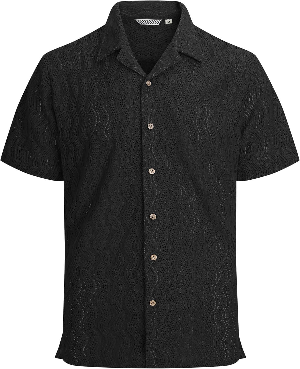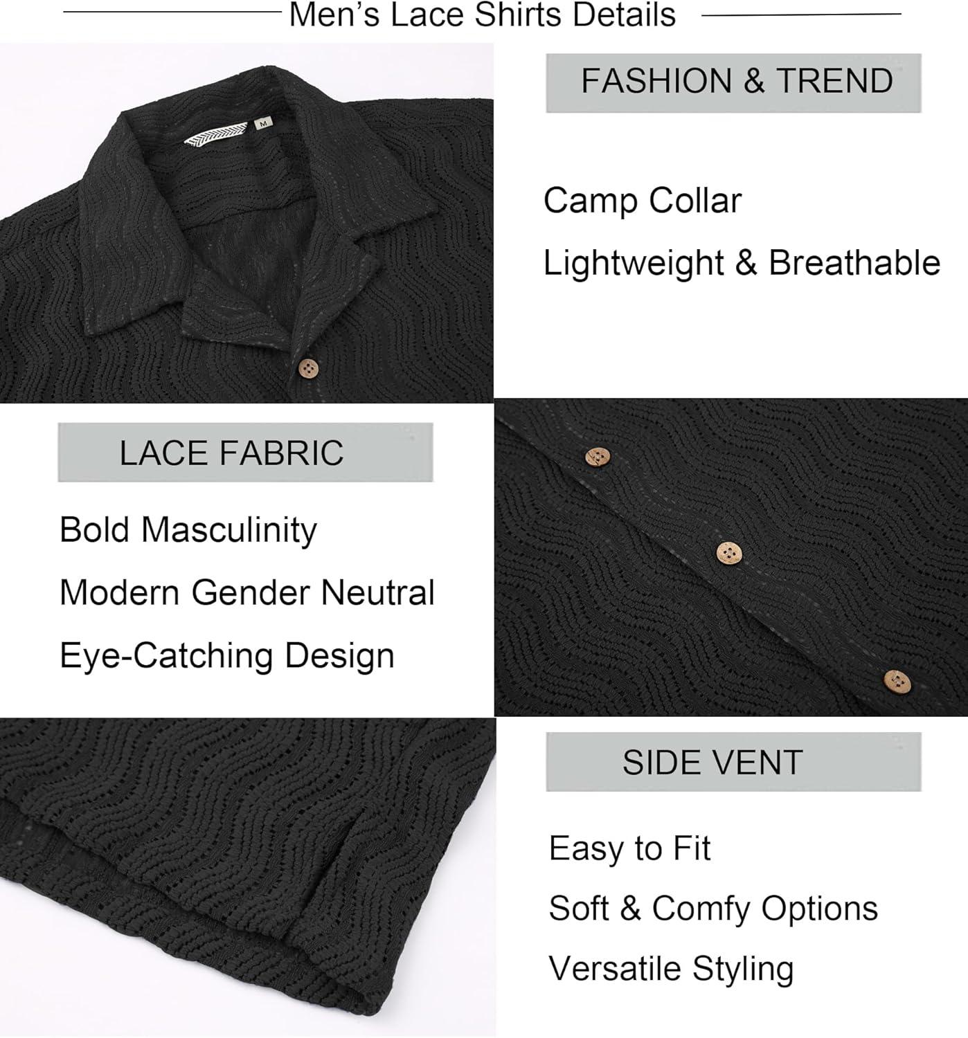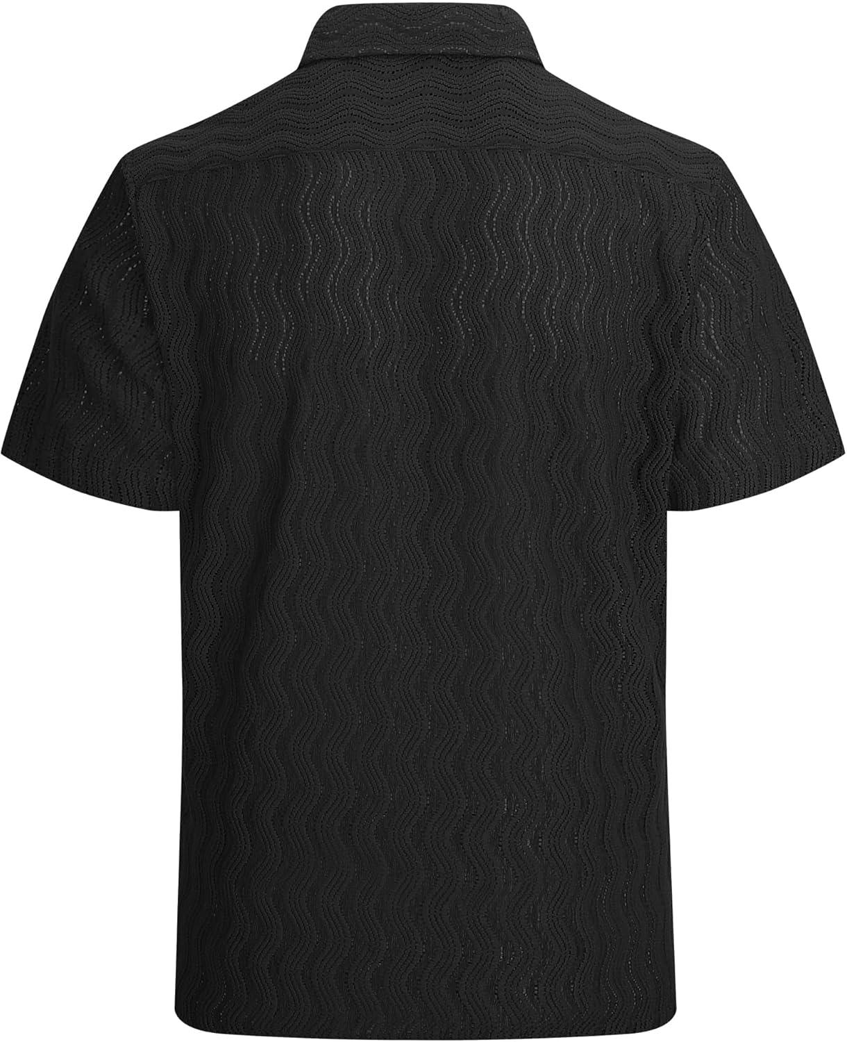 Alex Vando Mens Summer Shirts See Through Sheer Lace Casual Short Sleeve Button Down Beach Shirt(Wave Black)